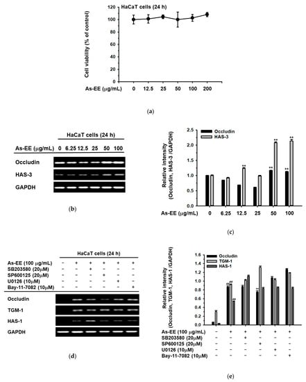 2.2. Effects of As-EE on Cell Viability and Skin Moisture Protection Activity