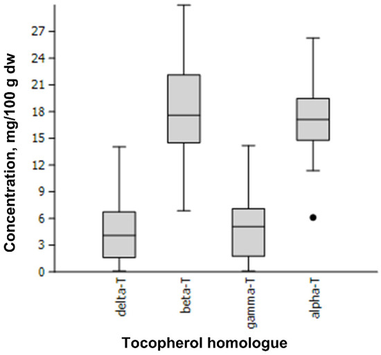 This study is the first large-scale screening of all four tocopherol homologues (alpha, beta, gamma and delta) in apple seeds. Tocopherol homologues were determined according to the previously validated RP-HPLC-FLD method [19]. All four tocopherol homologues were identified and quantified in one hundred eleven apple genotypes (Table 1). Each genotype was represented by three biological samples, ANOVA did not show statistically significant differences between biological samples or repetitions. A wide range of each tocopherol homologue concentration and high variability among tested apple samples was observed (Figure 1). The content of delta-T (0.695) and gamma-T (0.662) showed high diversity, whereas alpha-T and beta-T were less variable and more consistent among genotypes (coefficient of variation 0.203 and 0.256, respectively). The total tocopherol content ranged from 31.82 to 56.75 mg/100 g dw for cvs. ‘Mc Shay’ and ‘Kurzemes Svītrainais’, respectively. A similar range of total tocopherol concentration was reported in twelve cultivars of dessert and crab apples [13]. The mean percentage of individual tocochromanols was as follows: alpha-T (38.36%), beta-T (40.74%), gamma-T (10.93%), delta-T (9.97%), represented by mean content 17.48 (alpha-T), 18.56 (beta-T), 4.98 (gamma-T), and 4.54 (delta-T) mg/100 g, respectively.