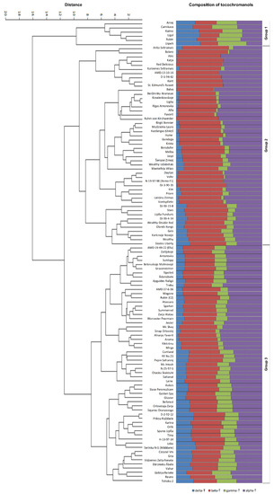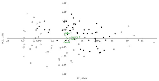 The unweighted pair group method with arithmetic mean (UPGMA), an agglomerative hierarchical clustering method based on Euclidean distances among tested apple genotypes, revealed three main cultivar groups (Figure 2), characterised by different proportions of tocopherol homologues (alpha, beta, gamma, and delta), supported by Principal Component Analysis (PCA) (Figure 3).