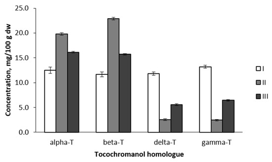 Comparison of tocopherol homologue content between apple groups identified in 111 tested genotypes. I, II and III—apple cultivar groups, identified by UPGMA cluster analysis (corresponds with Figure 2).