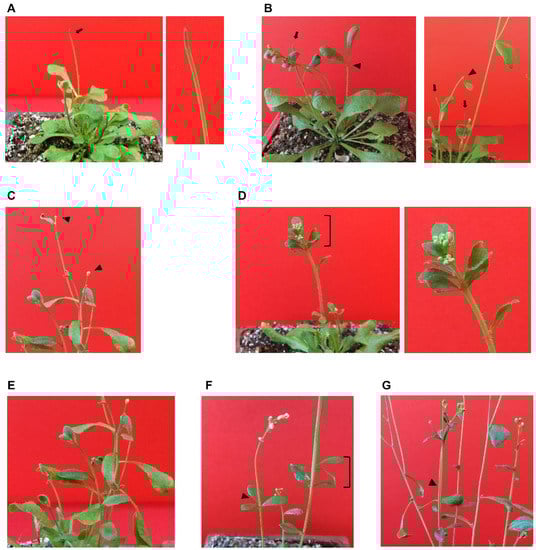 Phenotypic alterations observed in double homozygous plants with drastic reduction of MIT expression. (A) A pinoid stem (arrow) with the corresponding enlarged view. (B) Two plants with stems terminated at cauline leaves (arrowheads) and which also have pinoid stems (arrows). (C) A plant with stems terminated at unique flowers (arrowheads). (D) Multiple floral buds and cauline leaves at stem tip. (E) Higher number and irregular appearance of cauline leaves. (F) Three cauline leaves at the same position (arrowhead). (G) Enlarged stem (arrowhead).