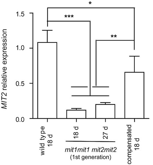 This intriguing result led us to analyze MIT2 expression by RT-qPCR in these “compensated” double homozygous mutant plants and compare it with that observed in plants showing an affected phenotype (the first generation of double homozygous mutant plants, arising from seeds obtained from plants carrying three mutated alleles) (Figure 7). Interestingly, MIT2 expression is significantly higher in compensated plants (60.9% that of wild type plants) compared with affected plants (11.0–18.5% that of wild type plants).
