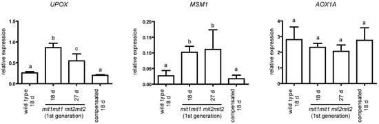 Expression of UPOX, MSM1, and AOX1A in double homozygous mutant plants. Transcript levels were determined by RT-qPCR and normalized to TIP41-like transcript level. Means ± SD of four biological replicates is shown. RNAs were prepared from seedlings at stages 1.03–1.04, i.e., 18 day old seedlings for wild type and “compensated” double homozygous mutant plants (mit1-1mit1-1 mit2-1mit2-1) and 27 day old seedlings for the first generation of the double homozygous mutant plants (same developmental stage), and also from 18 day old seedlings from these last plants (stage 1.0). Primer sequences are indicated in Supplementary Table S1. Statistically significant differences were determined by one-way ANOVA followed by Tukey’s multiple comparison test (same letter indicates no significant differences). For UPOX: a-b differences, p < 0.001; b-c differences, p < 0.01; for MSM1: a-b differences, p < 0.05.