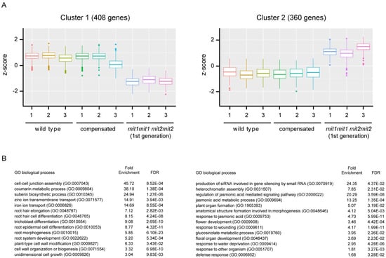 Differentially expressed genes between genotypes were identified (padj < 0.05, log2 [fold change] > 1 in any condition, LRT test) and grouped in two clusters by k-means (Figure 9). Interestingly, no significant differences (except for MIT expression) were found between wild type plants and compensated plants (Wald test, padj = 3.08 × 10−18, log2 fold change = −4.2), further supporting the conclusion that partial expression (around 30%) of one of the two MIT genes is sufficient for normal plant growth and development. In cluster 1 (408 genes, listed in Supplementary Table S4), expression is downregulated in double homozygous mutant plants (1st generation) when compared with wild type and compensated plants. In cluster 2 (360 genes, listed in Supplementary Table S5), higher levels of transcripts are found in the double homozygous mutant plants (1st generation).