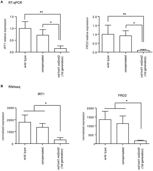 Cluster 1 shows an overrepresentation of genes belonging to the Gene Ontology annotation categories of iron ion transport (GO:0006826; FDR 8.6 × 10−4, 14.7 fold enrichment) and coumarin metabolic process (GO: 0009804; FDR 1.4 × 10−4, 38.1 fold enrichment); coumarins being involved in iron chelation in the rhizosphere for incorporation into the plant [32,33,34]. For instance, FRO2 (At1g01580, ferric reduction oxidase 2), IRT1 (At4g19690, iron-regulated transporter 1), IRT2 (At4g19680, iron-regulated transporter 2), FIT1/FRU/bHLH29 (At2g28160, FER-like iron deficiency induced transcription factor), IREG2/FPN2 (At5g03570, iron-regulated transporter 2, ferroportin 2), BTSL2 (At1g74770, zinc finger BRUTUS-like protein 2), and NAS2 (At5g56080, nicotianamine synthase 2), are in cluster 1. The downregulation of FRO2 and IRT1 was also independently verified by RT-qPCR (Figure 10). Other relevant overrepresented biological processes in cluster 1 are related to growth processes, including root hair elongation, plant-type cell wall modification, and unidimensional cell growth, which are consistent with the growth deficiency phenotypes presented in the double homozygous mutants (Supplementary Table S6).