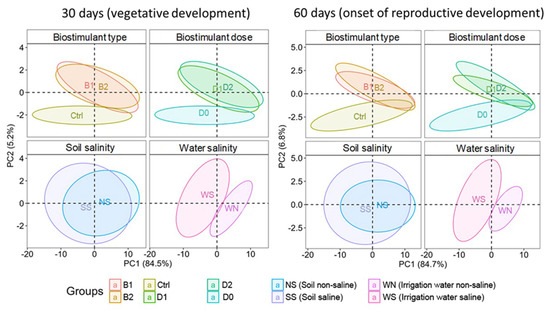 Principal component analysis (PCA). An interaction graph of the four experimental factors studied at 30 days in the vegetative developmental stage (left) and at 60 days, at the beginning of reproductive development (right), in Solanum lycopersicum plants. The factors studied were: Biostimulant type [Ctrl: control; B1: biostimulant with polyphenols at 1.4% (w/w) and glycine betaine at 3.0% (w/w); B2: biostimulant with polyphenols at 1.4% (w/w) and glycine betaine at 5.0% (w/w)]; Biostimulant dose (D0: 0 mL L−1 irrigation water; D1: 0.4 mL L−1 irrigation water; D2: 0.8 mL L−1 irrigation water); Soil salinity (Soil non-saline (NS): EC = 2.28 dS/m; Soil saline (SS): EC = 8.55 dS/m); Water salinity (Irrigation water non-saline (WN): EC = 0.91 dS/m; and Irrigation water saline (WS): EC = 10.50 dS/m).