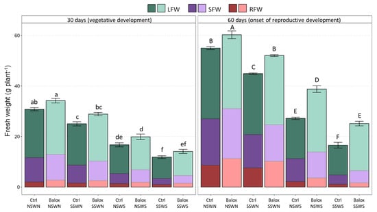 Total fresh weight, shown as the sum of root, stem, and leaf FW, of tomato plants subjected to increasing salinity by different combinations of saline or non-saline soil and irrigation water; the plants were treated, or not, with the biostimulant containing polyphenols at 1.4% (w/w) and glycine betaine at 3.0% (w/w) at a dose of 0.4 mL L−1 of irrigation water. Symbols: LFW, leaf fresh weight; SFW, stem fresh weight; RFW, root fresh weight. The control treatments without biostimulant (Ctrl) and with biostimulant (BALOX®) are defined as follows: (i) NSWN: Non-saline soil (EC = 2.28 dS/m) and non-saline water (EC = 0.91 dS/m); (ii) SSWN: Saline soil (EC = 8.55 dS/m) and non-saline water (EC = 0.91 dS/m); (iii) NSWS: Non-saline soil (EC = 2.28 dS/m) and saline water (EC = 10.50 dS/m); (iv) SSWS: Saline soil (EC = 8.55 dS/m) and saline water (EC = 10.50 dS/m). The evaluation periods: 30 days and 60 days of treatments. The values are the means ± SE (n = 3). Different letters above the bars (lowercase for 30 days and capital for 60 days treatments) indicate significant differences between treatments, according to the ANOVA test (p < 0.05). Statistical analyses were performed independently for the two treatment periods.