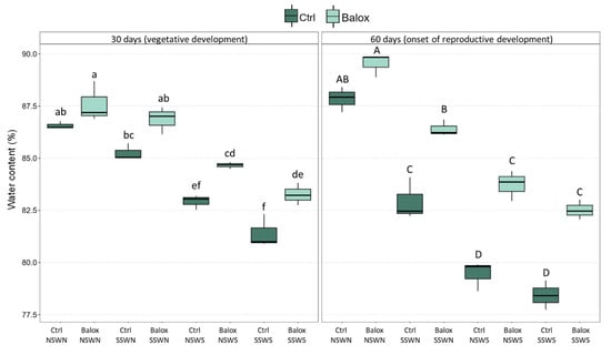 Total water content in tomato plants subjected to increasing salinity by different combinations of saline or non-saline soil and irrigation water; the plants were treated, or not, with the biostimulant containing polyphenols at 1.4% (w/w) and glycine betaine at 3.0% (w/w) at a dose of 0.4 mL L−1 of irrigation water. The control treatments without biostimulant (Ctrl) and with biostimulant (BALOX®) are defined as follows: (i) NSWN: Non-saline soil (EC = 2.28 dS/m) and non-saline water (EC = 0.91 dS/m); (ii) SSWN: Saline soil (EC = 8.55 dS/m) and non-saline water (EC = 0.91 dS/m); (iii) NSWS: Non-saline soil (EC = 2.28 dS/m) and saline water (EC = 10.50 dS/m); (iv) SSWS: Saline soil (EC = 8.55 dS/m) and saline water (EC = 10.50 dS/m). The evaluation periods: 30 days and 60 days of treatments. The values are the means ± SE (n = 3). Different letters above the bars (lowercase for 30 days and capital for 60 days treatments) indicate significant differences between treatments, according to the ANOVA test (p < 0.05). Statistical analyses were performed independently for the two treatment periods.