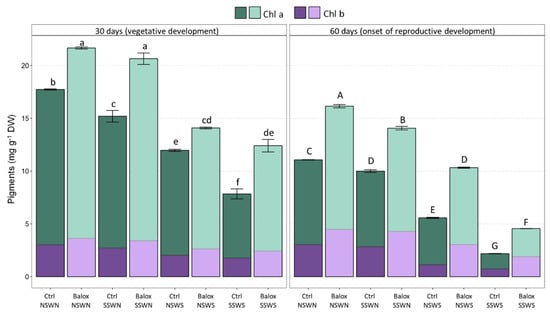 The mean values of total chlorophylls (Figure 4) and total carotenoids (Figure 5), showed a significant decreasing trend that can be related to the increasing salinity, being more pronounced at the end of the experiment (60 days). For example, total chlorophyll levels of control plants in non-saline conditions (CtrlNSWN) decreased by ca. 50% in plants grown for 60 d in non-saline soil and irrigated with saline water (CtrlNSWS), and by 80% under the highest salinity conditions tested, saline soil and saline irrigation (CtrlSSWS) (Figure 4). Separate data for chlorophylls a and b are shown in Table S4 of the Supplementary Materials. The relative reduction in total carotenoid contents with increasing salinity was similar to that determined for chlorophylls (Figure 5). Application of the biostimulant BALOX® resulted in a statistically significant increase in chlorophylls a and b (Supplementary Materials, Table S4), total chlorophyll (Figure 4), and total carotenoid (Figure 5) contents. Here again, the relative effect of the biostimulant was more pronounced after 60 d of treatments and at higher salinities. For example, total chlorophyll contents increased about 1.5-fold in tomato plants grown for 60 d under non-saline conditions and 2.1-fold in saline soil with saline irrigation (Figure 4).