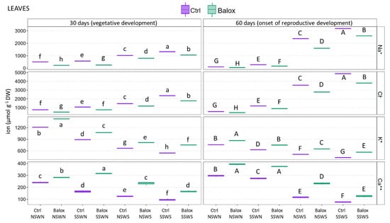 Ion contents in leaves: sodium (Na+), chloride (Cl−), potassium (K+), and calcium (Ca2+) in tomato plants subjected to increasing salinity by different combinations of saline or non-saline soil and irrigation water; the plants were treated, or not, with the biostimulant containing polyphenols at 1.4% (w/w) and glycine betaine at 3.0% (w/w) at a dose of 0.4 mL L−1 of irrigation water. The control treatments without biostimulant (Ctrl) and with biostimulant (BALOX®) are defined as follows: (i) NSWN: Non-saline soil (EC = 2.28 dS/m) and non-saline water (EC = 0.91 dS/m); (ii) SSWN: Saline soil (EC = 8.55 dS/m) and non-saline water (EC = 0.91 dS/m); (iii) NSWS: Non-saline soil (EC = 2.28 dS/m) and saline water (EC = 10.50 dS/m); (iv) SSWS: Saline soil (EC = 8.55 dS/m) and saline water (EC = 10.50 dS/m). The evaluation periods: 30 days and 60 days of treatments. The values are the means ± SE (n = 3). Different letters above the bars (lowercase for 30 days and capital for 60 days of treatments) indicate significant differences between treatments, according to the ANOVA test (p < 0.05). Statistical analyses were performed independently for the two treatment periods.
