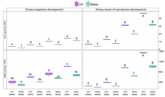 Hydrogen peroxide (H2O2) and malondialdehyde (MDA) contents in leaves of tomato plants subjected to increasing salinity by different combinations of saline or non-saline soil and irrigation water; the plants were treated, or not, with the biostimulant containing polyphenols at 1.4% (w/w) and glycine betaine at 3.0% (w/w) at a dose of 0.4 mL L−1 of irrigation water. The control treatments without biostimulant (Ctrl) and the treatments with biostimulant (BALOX®) are defined as follows: (i) NSWN: Non-saline soil (EC = 2.28 dS/m) and non-saline water (EC = 0.91 dS/m); (ii) SSWN: Saline soil (EC = 8.55 dS/m) and non-saline water (EC = 0.91 dS/m); (iii) NSWS: Non-saline soil (EC = 2.28 dS/m) and saline water (EC = 10.50 dS/m); (iv) SSWS: Saline soil (EC = 8.55 dS/m) and saline water (EC = 10.50 dS/m). The evaluation periods: 30 days and 60 days of treatments. The values are the means ± SE (n = 3). Different letters above the bars (lowercase for 30 days and capital for 60 days of treatments) indicate significant differences between treatments, according to the ANOVA test (p < 0.05). Statistical analyses were performed independently for the two treatment periods.