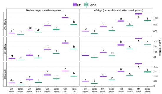BALOX® application resulted, in all treatments, in a reduction of the average specific activity values for the three enzymes, which was statistically significant in all circumstances except in the samples harvested after 30 days of treatment under non-saline conditions (NSWN) and in saline soil (SS) for SOD, and in the NSWN for CAT and GR activities. Under the highest salinity conditions (SSWS, 60 days), these reductions amounted to ca. 30%, 25%, and 35% for SOD, CAT, and GR, respectively (Figure 10).