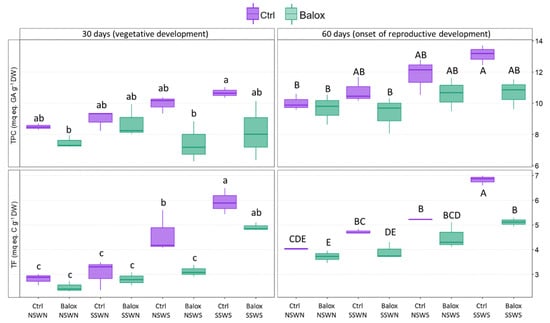 Content of total phenolic compounds (TPC) and total flavonoids (TF) in leaves of tomato plants subjected to increasing salinity by different combinations of saline or non-saline soil and irrigation water; the plants were treated, or not, with the biostimulant containing polyphenols at 1.4% (w/w) and glycine betaine at 3.0% (w/w) at a dose of 0.4 mL L−1 of irrigation water. The control treatments without biostimulant (Ctrl) and the treatments with biostimulant (BALOX®) are defined as follows: (i) NSWN: Non-saline soil (EC = 2.28 dS/m) and non-saline water (EC = 0.91 dS/m); (ii) SSWN: Saline soil (EC = 8.55 dS/m) and non-saline water (EC = 0.91 dS/m); (iii) NSWS: Non-saline soil (EC = 2.28 dS/m) and saline water (EC = 10.50 dS/m); (iv) SSWS: Saline soil (EC = 8.55 dS/m) and saline water (EC = 10.50 dS/m). The evaluation periods: 30 days and 60 days of treatment. The values are the means ± SE (n = 3). Different letters above the bars (lowercase for 30 days and capital for 60 days of treatments) indicate significant differences between treatments, according to the ANOVA test (p < 0.05). Statistical analyses were performed independently for the two treatment periods.