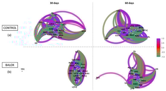 Correlation network plot showing the significant correlations (p < 0.05) between the 30 traits measured in each period (30 days: vegetative development; 60 days: onset of reproductive development) in the control (a) and plants treated with the biostimulant containing polyphenols at 1.4% (w/w) and glycine betaine at 3.0% (w/w) at a dose of 0.4 mL L−1 of irrigation water (b), according to Pearson’s correlation coefficients. Each measured trait represents a node, and highly correlated traits are grouped. Only significant correlations are represented. Each path represents a correlation between the two variables it links. The purple path represents a positive correlation, and the green path represents a negative correlation. The width and transparency of the line represent the strength of the correlation, so the thicker and more intense the line, the stronger the correlation. Abbreviations: SL: stem length; SD: stem diameter; NL: number of leaves; RFW: root fresh weight; SFW: stem fresh weight; LFW: leaf fresh weight; RWC: root water content; SWC: stem water content; LWC: leaf water content; Chl. a: chlorophyll a; Chl. b, chlorophyll b; Caro, total carotenoids; R [Ca], root calcium; L [Ca], leaf calcium; R [K], root potassium; L [K], leaf potassium; R [Na], root sodium; L [Na], leaf sodium; R [Cl], root chloride; leaf chloride, L [Cl]; Pro, proline; GB, glycine betaine; TSS, total sugars; MDA, malondialdehyde; H2O2, hydrogen peroxide; SOD, superoxide dismutase; CAT, catalase; GR, glutathione reductase; TPC, total phenolic compounds; and TF, total flavonoids.
