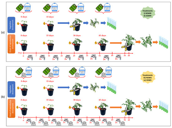 The experiments were based on a multivariate design that consisted of the use of a biostimulant (BALOX®) with a high content of polyphenols and glycine betaine, applied under two formulations: B1: concentrations of 1.4% and 3.0% (w/w) of polyphenols and glycine betaine, respectively, and B2: with a variation in the concentration of glycine betaine at 5.0% (w/w) and the same polyphenol content (1.4%). Two doses of the biostimulant were used (D1: 0.4 mL L−1 irrigation water and D2: 0.8 mL L−1 irrigation water). In addition, two soil conditions, non-saline (EC = 2.28 dS/m) and saline soil (EC = 8.55 dS/m), and two types of irrigation, with non-saline (EC = 0.91 dS/m) and with saline water (EC = 10.50 dS/m) were included in the experiments. The biostimulant was applied in Hoagland solution to each pot at the basal part of the plant. The treatments were extended for 30 days for plants in the vegetative phase of development and for 60 days for plants at the beginning of reproductive development. Control plants (Ctrl) were cultivated without biostimulants (D0: 0 mL L−1 irrigation water) while maintaining the same experimental design.
