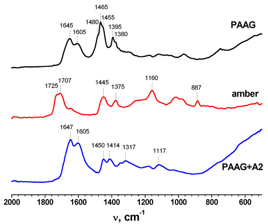 The FTIR spectra of dried initial PAAG gel, initial amber, and PAAG-gels with amber are given in Figure 1. The most informative peaks of all studied materials were in the range of 1800–800 cm−1. The spectrum of PAAG showed two bands at 3436 and 2924 cm−1, which corresponded with the N–H stretching vibration of the NH2 group and C–H stretching vibrations. The bands at 1645 and 1465 cm−1 were attributed to the stretching of the C=O group in amide and CH2 scissoring, respectively [38]. In the FTIR spectrum of initial amber, the wide shoulder of the 1160 cm−1 peak stretching to 1260 cm−1 (known as “Baltic shoulder”) corresponded to the high content of succinic acid and other succinate compounds. The intense peak at ~1700 cm−1 was characteristic of the C=O group of carboxylic acids. The bands at 1445 and 1375 cm−1 were attributed to C–H symmetric and asymmetric stretching vibrations. The 887 cm−1 band could be assigned to the out-of-plane aromatic C–H bending [39,40].