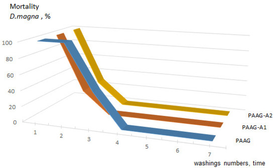 Dynamics of mortality of D. magna individuals depending on the number of washings: PAAG—homopolyacrylamide gel; PAAG-A1—homopolyacrylamide gel containing 5.8% raw amber; PAAG-A2—homopolyacrylamide gel containing 5.7% amber crumb.