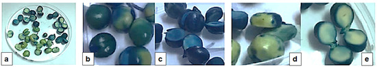 Visualization of Nelyubov method used for determining the viability of peas (b,d) and chickpeas (c,e): (a) the control (distilled water); (b,c) the first washing; (d,e) the second washing. The incubation time was 90 min.