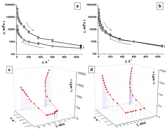 Dependence of effective viscosity (η, mPa · s) of polyacrylamide gel (PAAG) (b,d) and agar gel (a,c) (a,b)—on the shear rate (γ, s−1); (c,d)—on the shear rate (γ, s−1) over time (t, min).