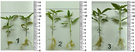 Increases in the number of metric indicators of leaf blades were also found. It was found that the dose-dependent effect of plant extracts on test subjects persisted (Figure 6, Table 4). In general, using a hydrogel instead of agar stimulated the growth of Cánnabis satíva. Use of hydrogel-amber substrate increased metric indicators of seedlings (in comparison to agar): the root length increased by 28%, stem length—by 26.7%, root weight—by 167%, stem weight—by 67%, root and stem length—by 27%, and root and stem weight—by 50%.