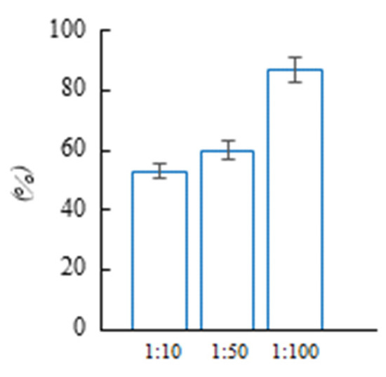 In addition, the allelopathic activity of extract from biological material in 1:10, 1:50, and 1:100 dilutions was studied. It was shown that allelopathic stress is dose-dependent when a typical MS medium is used. Under 1:10 dilution, Cucumis sativus L. growth inhibition of up to 53% was observed; however, growth inhibition reached 87% (Figure 7). Under 1:100 dilution, the “suppressive” effect showed almost no decrease (95%).