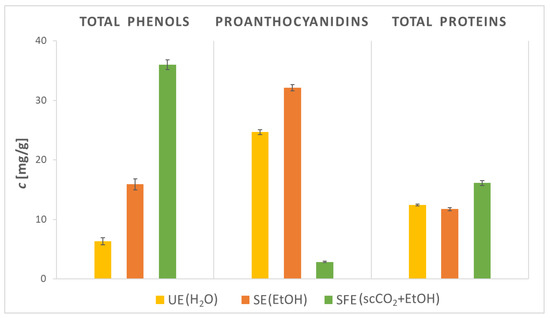 Content of total phenols (TPC), proanthocyanidins (PAC), and total proteins (PC) in AS extracts obtained by ultrasonic extraction (UE; solvent H2O), Soxhlet extraction (SE; solvent EtOH), and supercritical fluid extraction (SFE; solvent scCO2, co-solvent EtOH).