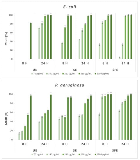 Gram-negative P. aeruginosa was the least susceptible to the addition of UE extract, as only the highest added concentration of the extract achieved its complete growth inhibition. Lower concentrations of UE extract, however, resulted in MGIRs of up to 65%. On the contrary, SE and SFE extracts even with the addition of the lowest concentration, 70 μg/mL, showed MGIRs between 46–64% after 8 and 24 h. In the case of the addition of SE extract as an inhibitor, higher-than-90% MGIRs were achieved with a concentration of 280 μg/mL. However, the SFE extract proved to be exceptionally effective as a growth inhibitor of P. aeruginosa, as it reached 95% MGIR after 8 h of incubation with 140 μg/mL of the added extract and 97% MGIR after 24 h of incubation with 280 μg of SFE extract per mL of suspension.