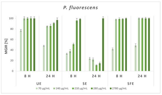 Exceptional results of antibacterial efficiency were achieved with the addition of UE and SFE extracts as inhibitors on the growth of Gram-negative P. fluorescens. After 8 h of incubation, the addition of 70 μg/mL UE extract resulted in 77% MGIR, while 140 μg/mL and higher concentrations showed complete inhibition of P. aeruginosa growth. After 24 h of incubation, the lowest concentration inhibited its growth with 50% MGIR, and further concentrations resulted in more than 85% MGIRs. After 8 h of incubation of P. aeruginosa with 210 μg/mL SE extract, the result was 50% MGIR and 96% with the addition of 280 μg/mL. The mentioned bacterium was less susceptible to lower concentrations of SE extract after 24 h of incubation, but the highest concentration of 2780 μg/mL still completely inhibited its growth. Importantly, even the lowest added concentrations of SFE extract significantly affected the growth of P. aeruginosa (42 and 49% MGIR after 8 and 24 h), while the addition of 140 μg/mL SFE extract completely inhibited its growth in both time periods.