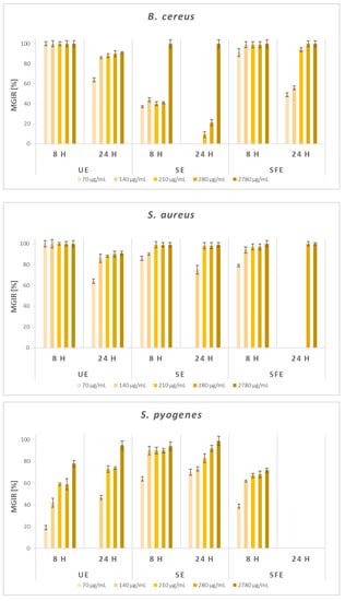 The effect of the addition of AS extracts as inhibitors on Gram-positive S. pyogenes was also investigated. In contrast to B. cereus and S. aureus, the greatest antibacterial potential was shown by SE extract, where even lower concentrations resulted in higher MGIRs compared to UE and SFE extracts. After 8 h, 140 μg/mL of SE extract inhibited the growth of S. pyogenes by 90% and after 24 h by 73%, while higher concentrations resulted in MGIRs ranging between 83 and 99%. UE extract showed a higher level of inhibition after 24 h (47–95% MGIRs). In contrast, SFE extract showed a certain level of inhibition (39–72% MGIRs) after 8 h of incubation, while S. pyogenes was not susceptible to the addition of SFE extract after 24 h of incubation, which is in agreement with the findings of the disc diffusion method.