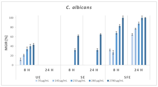 The results are in accordance with the disc diffusion method because even when using BMM, only the SFE extract showed good antifungal efficiency. UE extract resulted in 12–43% MGIRs after 8 h of incubation, but after 24 h, the fungus was not sensitive to the addition of the extract at all. In the case of the addition of SE extract as an inhibitor, lower concentrations did not affect the growth of C. albicans, and the two highest concentrations (2780 and 280 μg/mL) reached 32–65% MGIRs. On the other hand, the SFE extract was more effective against C. albicans. A higher degree of growth inhibition was achieved after 24 h of incubation, when even 70 μg/mL of SFE extract showed 65% MGIR, and complete inhibition was achieved with the addition of 210 μg/mL.