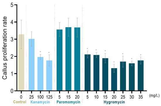 Effect of kanamycin, paromomycin and hygromycin on the proliferation rate of tamarillo callus. Callus proliferation rate is the ratio of fresh weight after thirty days of treatment and the initial one ± SD of at least three biological replicates. * means significant difference (p-value ≤ 0.0001) between the treatment and the control, according to Dunnett’s test.