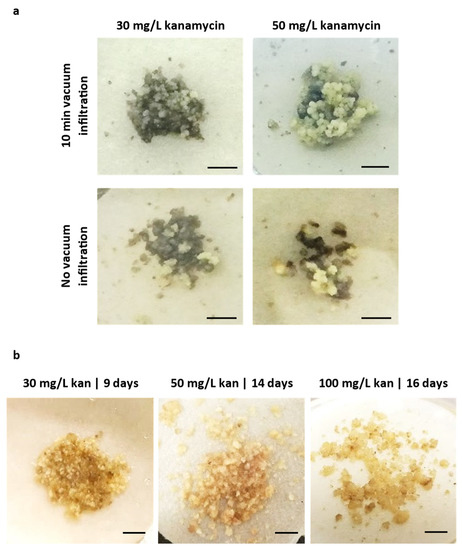 Tamarillo embryogenic callus inoculated with EHA105 Agrobacterium strain and incubated with increasing kanamycin concentrations. (a) Images represent inoculation with and without a 10 min vacuum, followed by incubation at 80 rpm and 28 °C for another 10 min. (b) Incubation in the selective medium with kanamycin at 30 mg/L for 9 days, 50 mg/L for 14 days and 100 mg/L for 16 days. Bars represent 0.5 cm.