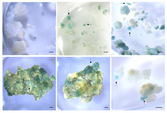 GUS assay in Agrobacterium-mediated genetic transformation of tamarillo embryogenic callus (EC). The negative control is non-transformed EC (first image). Arrows indicate indigo-blue coloration from GUS expression. Bars represent 1 mm.