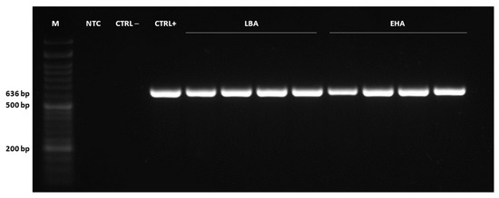 Four biological replicates of putative EC transformants were used to confirm the genetic transformation with each Agrobacterium strain (EHA105 and LBA4404). The genomic DNA (gDNA) was extracted from 100 mg of kanamycin-resistant and non-transformed callus, previously ground in liquid nitrogen, using the NucleoSpin™ Plant II kit (Macherey-Nagel™), following the manufacturer’s instructions. The concentration and quality of DNA were assessed using a NanoDrop™ One Spectrophotometer (Thermo Scientific, Waltham, MA, USA). The presence of the gus transgene was verified by PCR analysis using specific primers (forward 5′-CATGAAGATGCTTCG-3′ and reverse 5′-ATCCACGCCGTATTCGG-3′). Plasmid DNA (p35SGUSINT) was used as a positive control, DNA from non-transformed callus was used as a negative control and a non-template control was included. PCR reactions were carried out in a 25 μL final volume containing 12.5 µL NZYTaq II 2× Green Master Mix (NZYTech), 0.4 μM of each primer and 1 μL of genomic DNA. Amplification of a 636 bp fragment of the gus gene was performed by incubation at 95 °C for 3 min, followed by 35 cycles at 94 °C for 30 s, 65 °C for 30 s, 72 °C for 25 s and a final step at 72 °C for 7 min. Amplified products were separated by electrophoresis in a 1.5% (w/v) agarose gel stained with GreenSafe Premium (NZYTech) and visualized using the Gel Doc XR Imaging Systems (BioRad, Hercules, CA, USA).