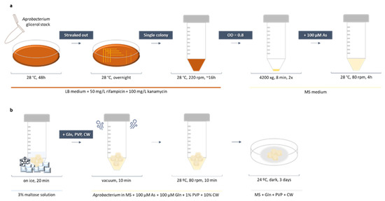 Frozen Agrobacterium glycerol stock cultures from both stains were thawed, and 20 µL were grown in solid LB medium supplemented with 50 mg/L rifampicin and 100 mg/L kanamycin at 28 °C in darkness for 2–3 days (Figure 7a). To isolate single colonies, a portion of the culture was streaked out onto a new plate and incubated overnight in the same conditions. A single colony was transferred to a 50 mL centrifuge tube containing 5 mL of liquid LB medium supplemented with 50 mg/L rifampicin and 100 mg/L kanamycin. Bacterial cultures were incubated on a shaker at 220 rpm and 28 °C until the OD at 600 nm reached 0.8 (16–21 h). Agrobacterium was centrifugated at 4200× g for 8 min, washed with MS plus 3% (w/v) sucrose and centrifugated again. The bacterial pellet was finally resuspended in 4 mL MS plus 3% (w/v) sucrose supplemented with 100 µM acetosyringone. Bacterial cultures were incubated on a shaker at 80 rpm and 28 °C for another 4 h before infection.