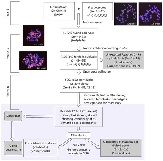 The scheme of the crosses and clone pedigree, together with the GISH images for the parental F. arundinacea and F1C0 and F2C1 hybrids, demonstrate the specificity of the L. multiflorum rhodamine labelled probe for highlighting simultaneously L. multiflorum (red) and F. pratensis (mauve) chromosomes. Abbreviations: Lm—L. multiflorum, Fp—F. pratensis, Fg—F. glaucescens (Fp and Fg are subgenomes comprising F. arundinacea parent). The experimental plot of this study is highlighted in light gray.