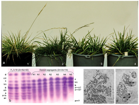Phenotype view of F2 3-18 L. multiflorum × F. arundinacea donor and its split tiller decadents, PGI-2 isozyme pattern, and split anaphases in hyperploid cells. (a) 1—F2 3-18 donor plant (2n = 6x = 42); 2—identical clone (2n = 6x = 42), 3&4—diploid segregants (2n = 2x = 14). (b) PGI-2 isozyme separation, lanes 1–2 for the F2 3-18 donor plant, lanes 3–4 for the clones identical to donor, lanes 5–11 for diploid clonal plants, N1–5 labeled; F2 3-18 donor plant and its identical clones show a complex a+, a, b, c, and d allelic profile (true isoform bands for the PGI-2 alleles are labeled in bold, hybrid bands in regular font), N1–4 diploids show a++bc, N5—bc allele set. (c) Anaphases in hyperploid cell show several split division plates. (d) Metaphases with more than 42 chromosomes and nuclei of different sizes (arrowed) with variable nucleoli numbers and their sizes; chromosome counts are ca 163 in (c) and 68 in (d) (lower left). Scale bars = 10 and 20 µm in (c) and (d), respectively.