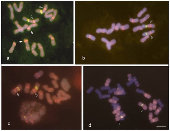 - Majka, J.; Bzdęga, K.; Janiak, A.; Ćwiek-Kupczyńska, H.; Krajewski, P.; Książczyk, T.; Zwierzykowski, Z. Cytogenetic and molecular genotyping in the allotetraploid Festuca pratensis × Lolium perenne hybrids. BMC Genom. 2019, 20, 367. [Google Scholar] [CrossRef] [PubMed]
