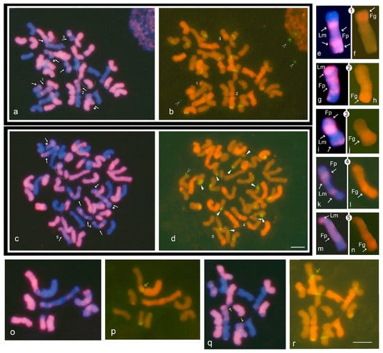 The types of recombinant chromosomes included all possible exchanges: doubles Lm/Fp, Fp/Fg, Lm/Fg, and triples Lm/Fp/Fg (Figure 4a–n, Table 2). GISH revealed a specific representation of F. pratensis in this hybrid karyotype, which appears clearly different from the representations of the other two species, L. multiflorum and F. glaucescens. Namely, F. pratensis chromosomal components were the least represented, but the most involved in chromosomal rearrangements (Figure 4a–d, Table 3).