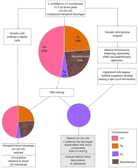 A proposed model of a diploid F. pratensis-like subgenome reassembly through a rare chromoanagenesis event in somatic tissues of L. multiflorum × F. arundinacea hybrid. Abbreviations: Lm—L. multiflorum, Fp—F. pratensis, Fg—F. glaucescens (Fp and Fg are subgenomes comprising F. arundinacea parent).
