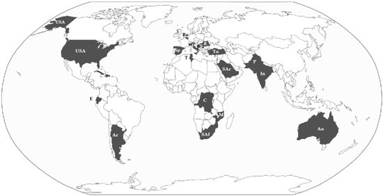 Map of the countries referring to the studied samples. Abbreviations: Ar = Argentina, Au = Australia, B = Bosnia and Herzegovina, Be = Belgium, C = Congo Democratic Republic, E = Equador, In = India, M = Mozambique, P = Pakistan, R = Romania, S = Serbia, Sar = Saudi Arabia, Sp = Spain, SAf = Republic of South Africa, Tu = Turkey, USA = United States of America.