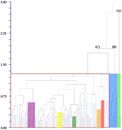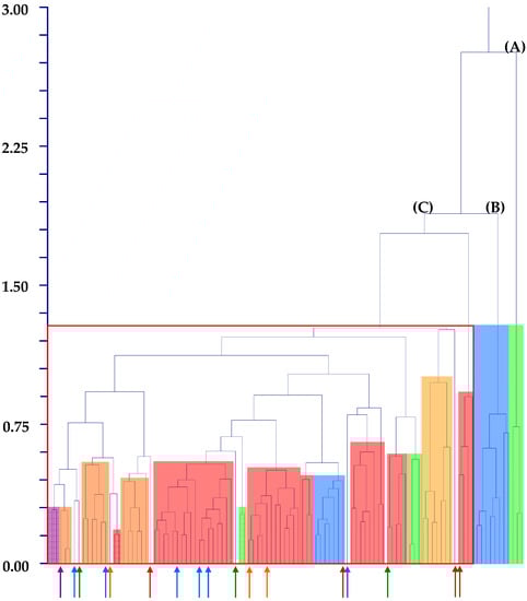 Dendrogram graph (hierarchical clustering, UPGMA method) of “molecular clades” sensu Waselkov et al. [15] (pag. 446, Figure 1A). Main clades: (A) = Galápagos-clade (light green); (B) = South American-clade (blue); (C) = residual-group (square with red sides); Hybridus-clade in red, Eurasian/South African/Australian (ESA)-clade in orange, Dioecious/Pumilus-clade in violet. Arrows indicate single samples of the various clades (colors are the same as those indicated in this caption), which are included in different clades or form isolated lineages.