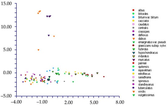 - By classifying the samples using the taxa names [species and below ranks (25 groups); see Table 1], DA predicted two main groups (Figure 5) based on the first two discriminant functions, which explain 71.3% of the total variation [eigenvalues: 52.2% (first function) and 19.1% (second function)]. These two groups (not overlapping each other) correspond to (a) the muricatus/viridis-group and (b) a large group including the remaining taxa (more or less overlapped each other). Concerning the muricatus/viridis-group, the matrix of actual/predicted groups displays high percentages along the diagonal (whose values reveal the matching actual/predicted observations for each group) for Amaranthus viridis (100%). In contrast, 50% of the actual observations for A. muricatus are predicted under A. viridis. Regarding the residual group, just a few taxa have actual/predicted observations matching each other (100%): A. centralis, A. graecizans subsp. sylvestris, A. induratus, A. rajasekharii, A. spinosus, and A. tuberculatus. On the contrary, low or very low percentages characterized the diagonal values of the other taxa, and, for A. caudatus, A. dubius, A. hypochondriacus, A. palmeri, and A. standleyanus, percentages are even zero. The value of correct classification is low (55.8%);