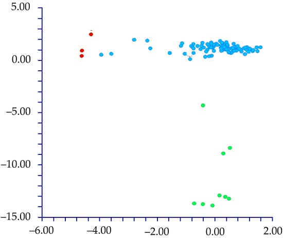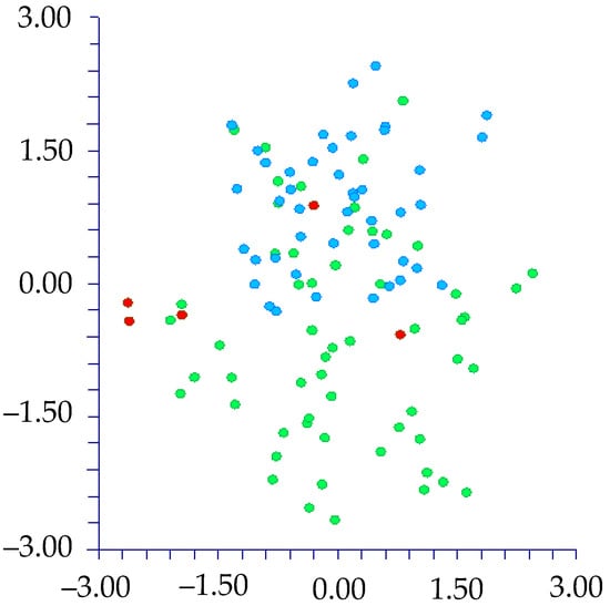 Figure 6. DA graph [first (axis-x) vs. second (axis-y) component] performed on samples classified using the subgenera names (blue dots: subgen. Amaranthus; red dots: subgen. Acnida; green dots: subgen. Albersia).As a whole, the value of correct classification is low (57.5%); - (3)
