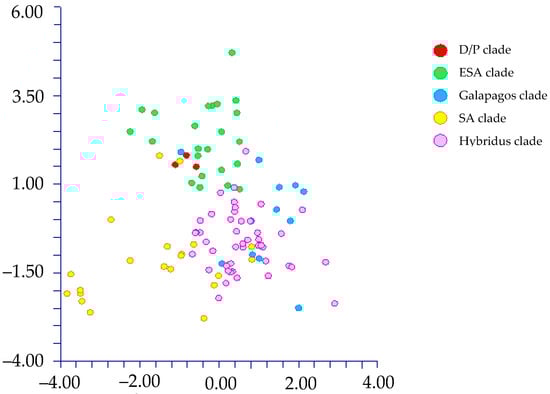 - After running the DA procedure on samples classified using Waselkov’s “molecular clades” [15] (pag. 446, Figure 1A, based on nuclear genes), two groups were predicted (Figure 7) based on the first two discriminant functions, which explain 88.5% of the total variation [eigenvalues: 58.8% (first function) and 29.7% (second function)]. These two groups correspond to (A) the Dioecious/Pumilus-group+ESA-group (=Eurasian/S-African/Australian group [15]) and (B) a larger group including the remaining “molecular clades” sensu Waselkov et al. [15]. Note that the ESA-group partially overlaps the residual-group. The matrix of actual/predicted groups displays high percentages along the diagonal (whose values reveal the matching of actual and predicted observations for each group) for the ESA-group (96%) and Hybridus-group (95.65%), whereas low percentages characterized by the diagonal values of the Galápagos-clade [16.67%, whereas most of the percentage (66.67%) is predicted under the Hybridus-group], the South American-clade [45.45%, whereas the 45.45% is predicted under the Hybridus-group); finally, concerning the Dioecious/Pumilus-group, the 100% of the actual samples are predicted under the ESA-group. As a whole, the value of correct classification is low (64.6%).
