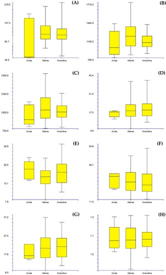 Hierarchical clustering (UPGMA method) shows three main groups. The first one is very small (A), including only samples of Amaranthus crassipes, a second small group (B) comprising samples of A. viridis and A. muricatus, and a third large group (C), with all the other samples/taxa (Figure 2). In group (C), several taxa (e.g., A. albus, A. hybridus, or A. hypochondriacus) are not grouped together, whereas some (A. centralis, A. graecizans subsp. sylvestris, A. induratus, A. retroflexus, and A. vulgatissimus) have a very low dissimilarity with each other and form separated subclades.