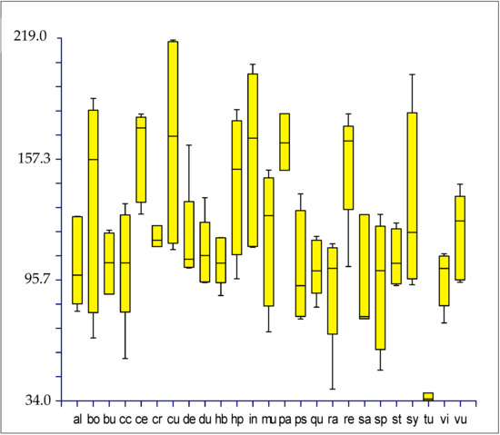 Figure 10. Box plots illustrating the variability of the length of the flat border of the seed (y-axis; measurements are in µm) per taxon (x-axis; abbreviation follow Table 1). - (3)