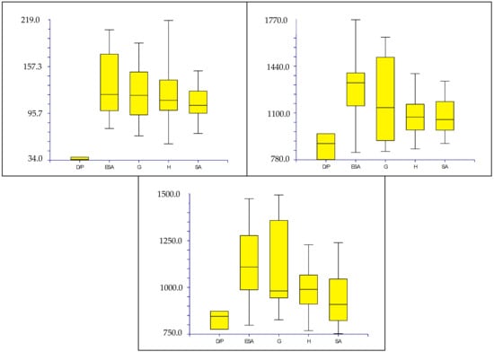 Figure 11. Box plots [characters (y-axes) per “molecular clades” (x-axes)] illustrating the variability of the length of flat border opposite to hilum (left graph), length of seed (central graph), and width of seed (right graph) (measurements are in µm). Abbreviation: D/P = Dioecius/Pumilus-clade; ESA = Eurasian/South African/Australian-clade; G = Galápagos-clade; SA = South American-clade; H = Hybridus-clade [clades according to Waselkov et al. [15] (pag. 446, Figure 1A]. - (4)