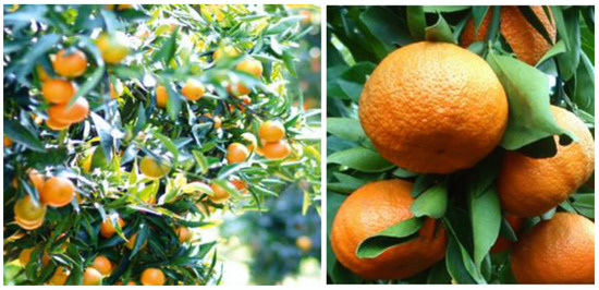 Citrus × clementina fruits (clementine) grow on different continents. In Europe, Italy is among the major producers. In particular, in Calabria, the cultivation of clementine is widespread due to the optimal climatic conditions, which contributed to the development of products awarded with Protected Geographical Indications certification in 1997 by the European Commission as “Clementine di Calabria IGP” [26]. Citrus × clementina is a Citrus fruit hybrid of mandarin and sweet orange. The clementine tree is very similar to the mandarin tree, though it has leaves that are larger and wider. C. × clementina fruits are usually seedless and typically juicy and sweet, with less acid than oranges [22].
