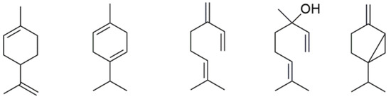 The anti-inflammatory properties of the most abundant C. medica and C. × clementina EOs constituents (Figure 3), such as limonene [65,66], γ-terpinene [65], sabinene, 1,8-cineole [67], myrcene [68], and linalool [69,70], have been the object of different studies.
